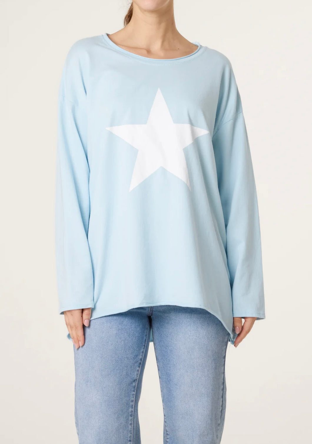 Stretchy cotton round neck white star top with long sleeves and a slight high low hem