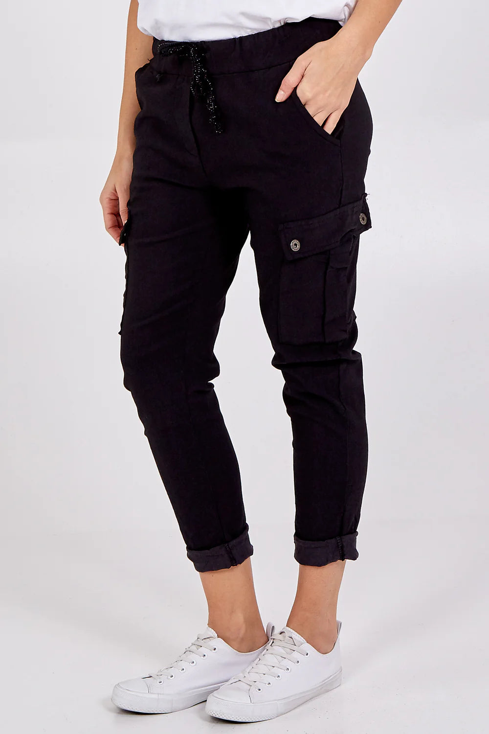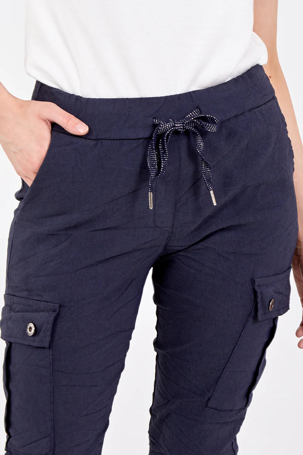 Super stretchy cargo trousers with beautiful QUALITY fabric. Magic trousers are extremely comfortable and light weight. This new cargo style trouser has a side button down and waist pockets and a draw string waist. They are ideal to roll up and wear with trainers or sandals.