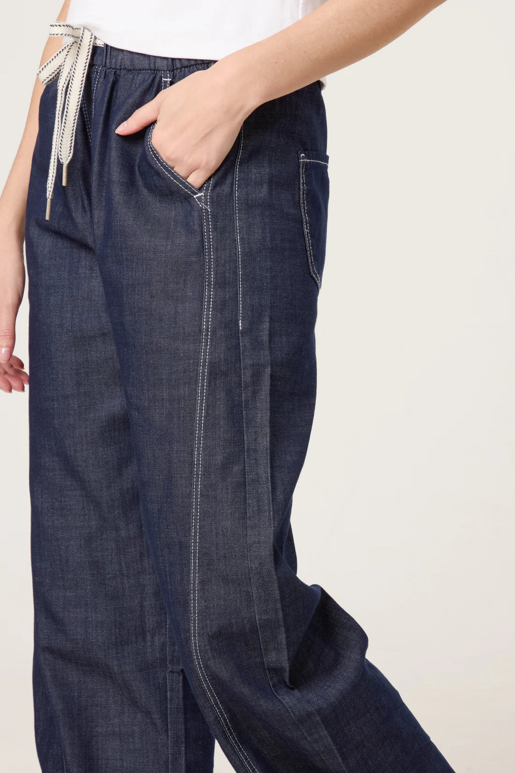 Fabulous dark denim pull on style stitch detail wide leg jeans with an elasticated drawstring waist band and front and back pockets.