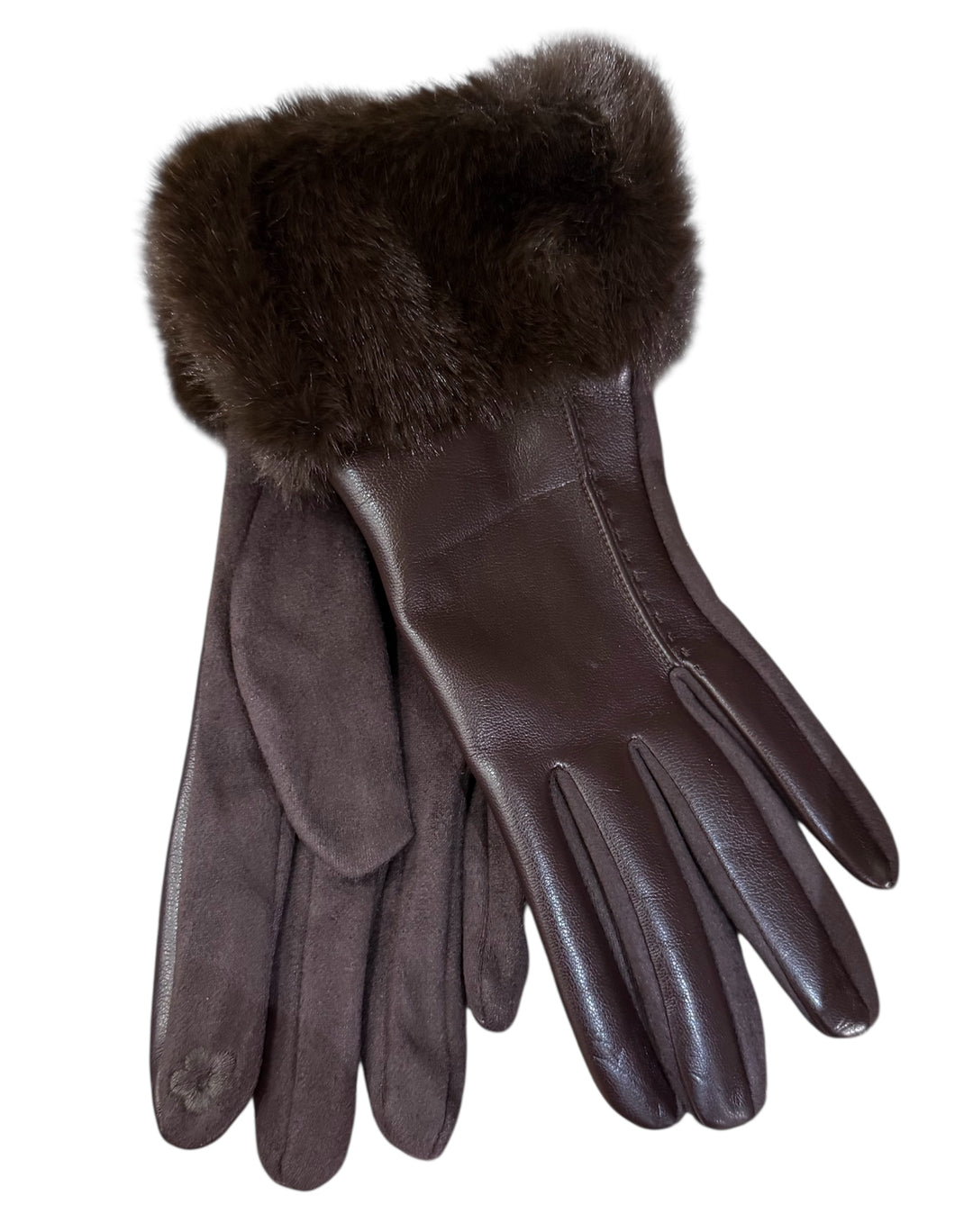 Stay warm and stylish with these stretchy pleather, suedette and faux fur collar gloves . These gloves are suitable for all sizes and are made from a blend of 90% polyester and 10% spandex, ensuring a comfortable fit.