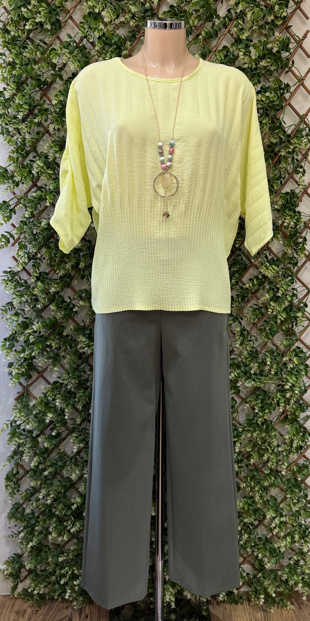 Flattering 3/4 sleeve top with a round neck , pleated details on lower part of the top and a batwing sleeve.