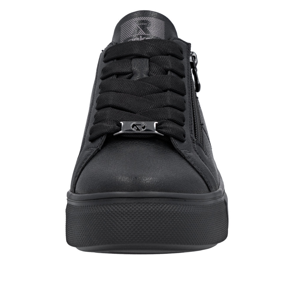 These black Rieker W2605-02 trainers are made of high-quality smooth leather. Super quick and easy to put on thanks to the top combination of zip and laces giving a perfect fit, Padded, cushioning and removable insole. Light micro velour and Drysport lining with breathable properties.