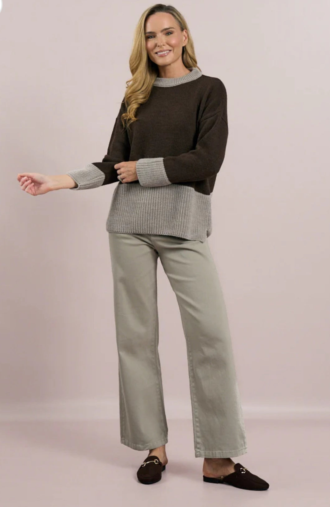 D.E.C.K By Decollage 5009-02 Round Neck Chocolate And Beige Colour Block Knit Jumper offers a wide hem band that adds structure and style and the sleeves are finished with a matching band.