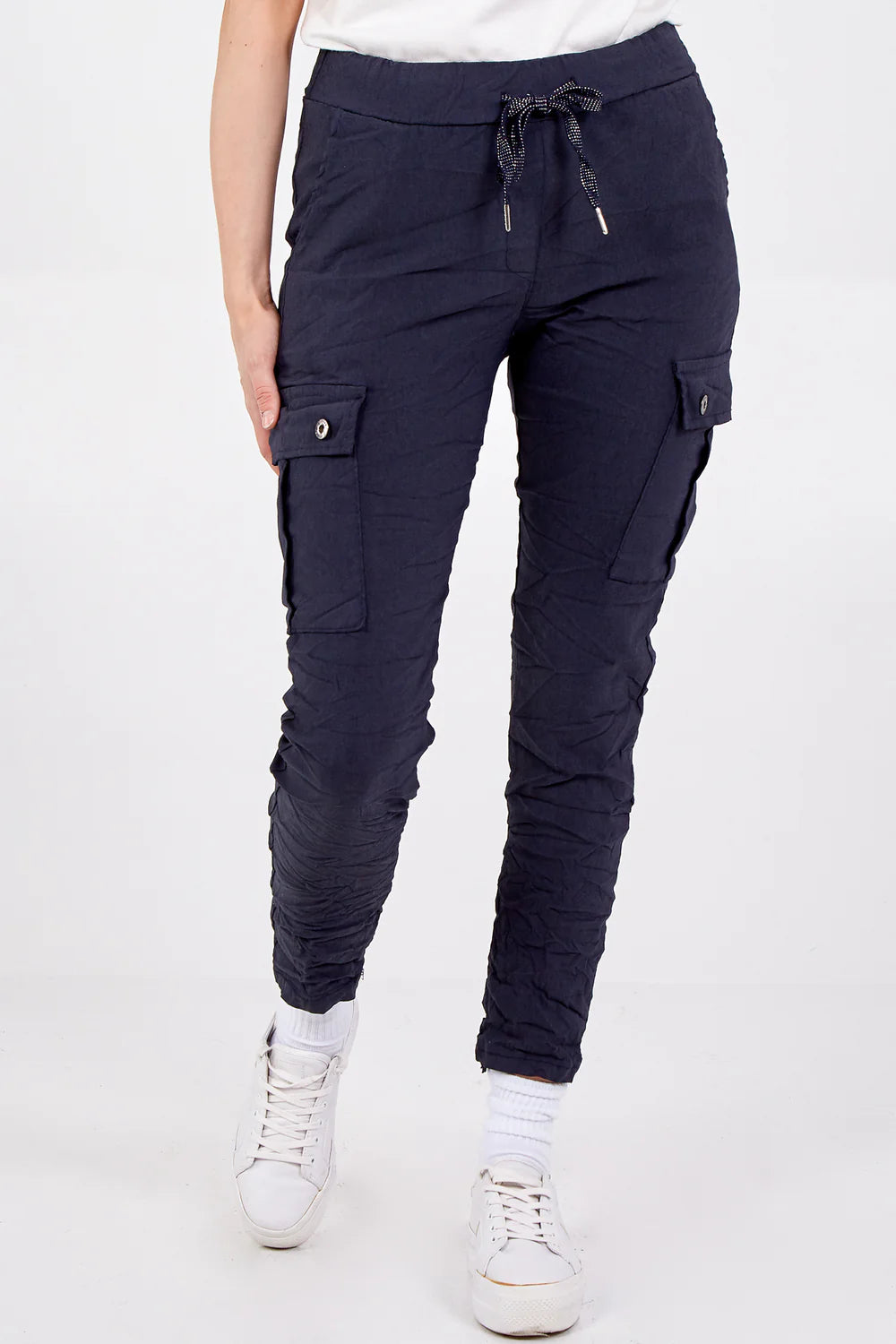 Super stretchy cargo trousers with beautiful QUALITY fabric. Magic trousers are extremely comfortable and light weight. This new cargo style trouser has a side button down and waist pockets and a draw string waist. They are ideal to roll up and wear with trainers or sandals.