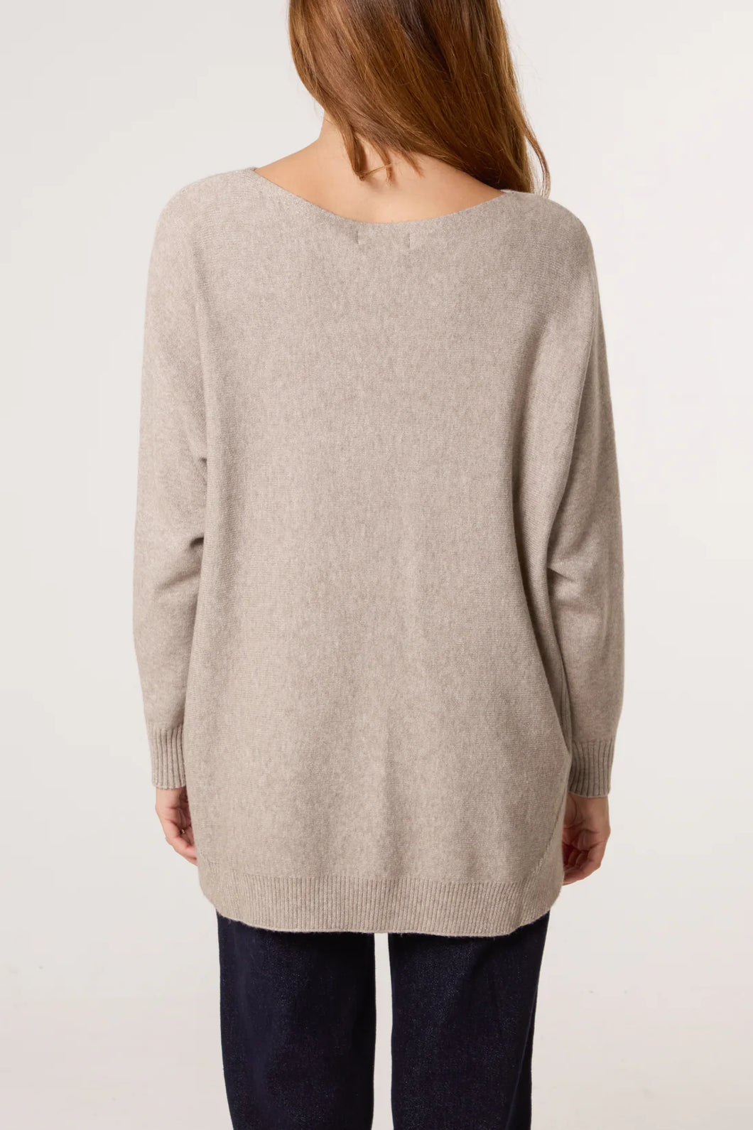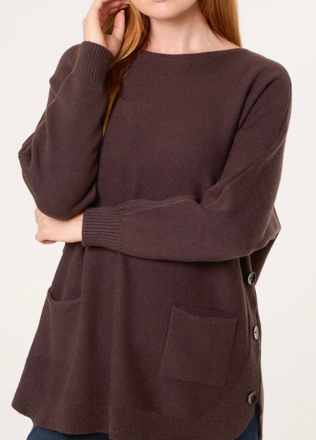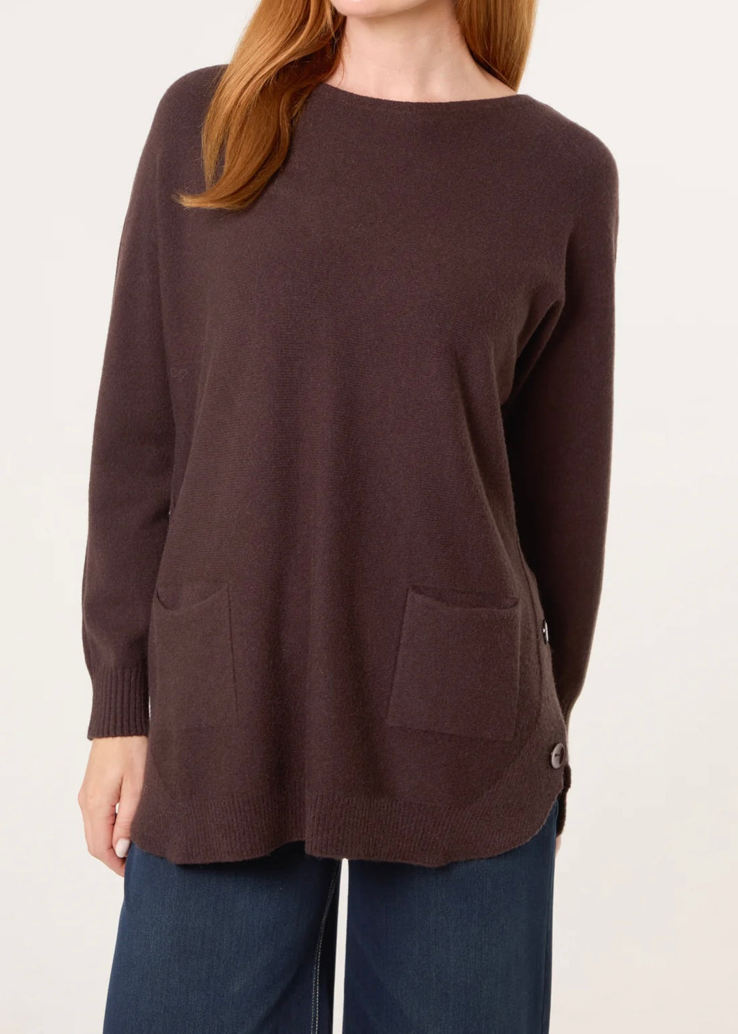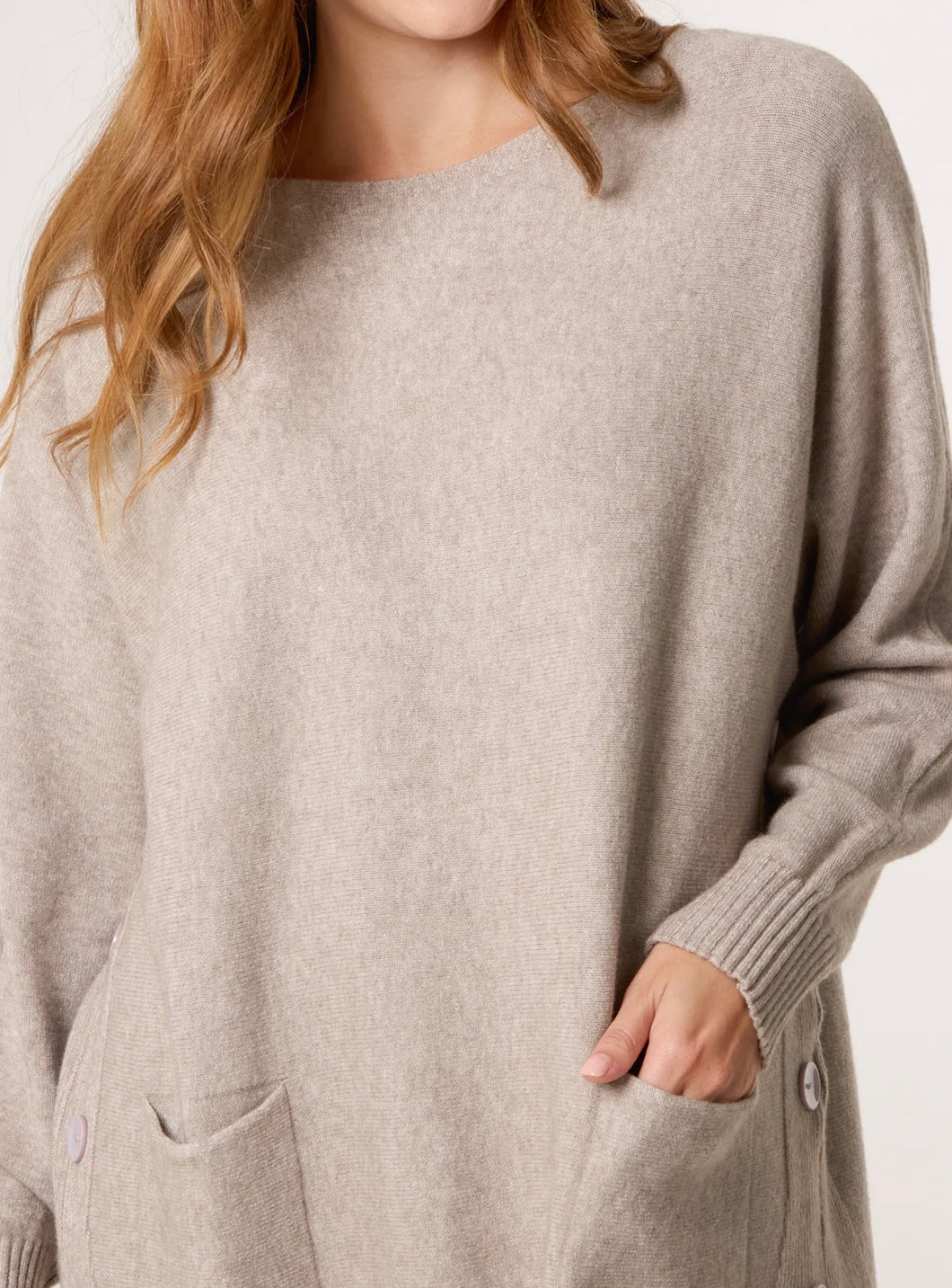 Classic style plain slash neck longline jumper with side button detail and front pockets.
