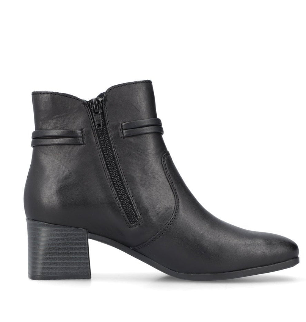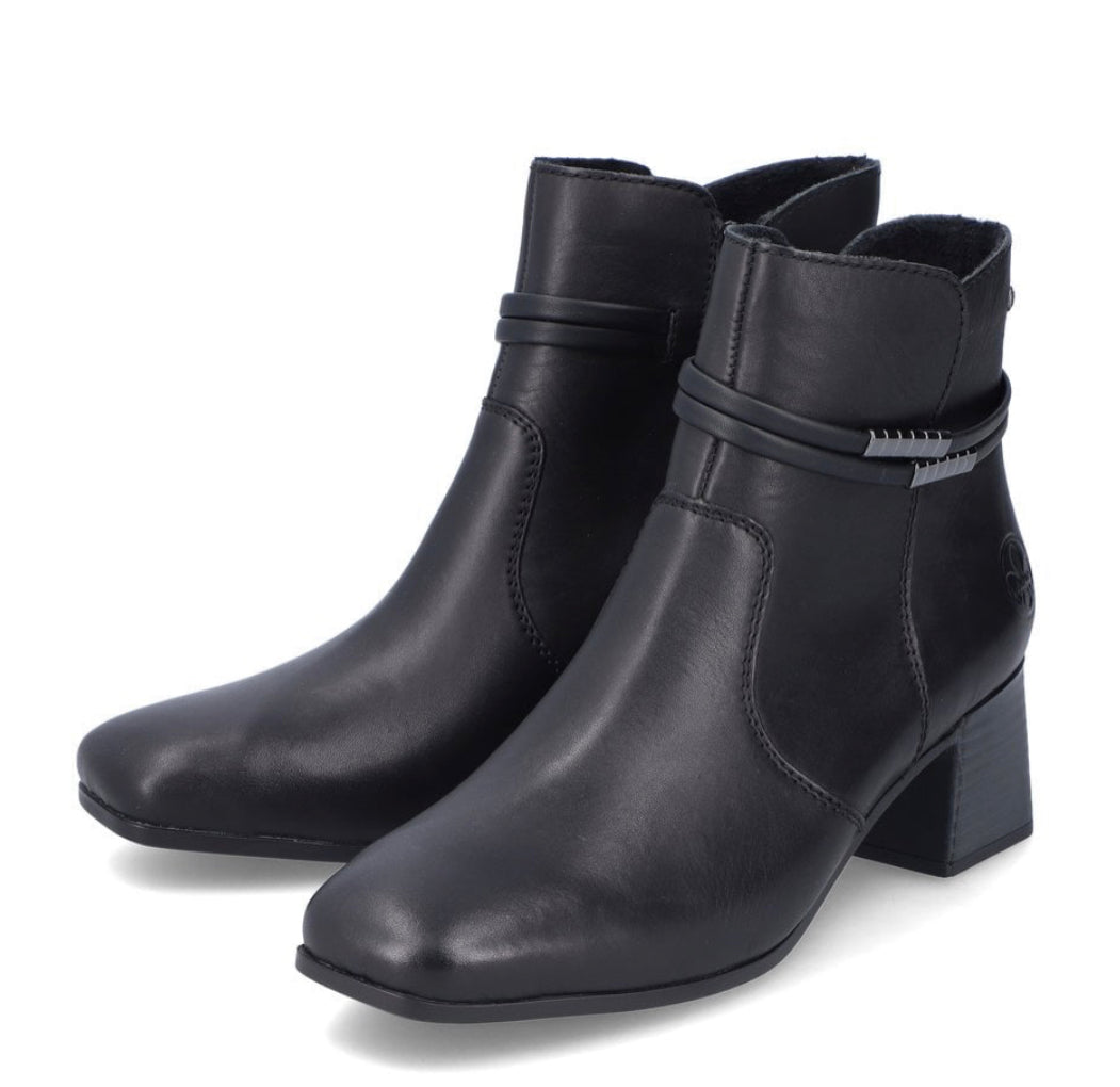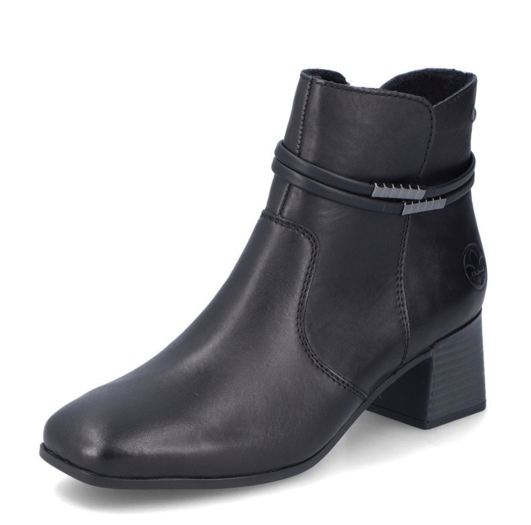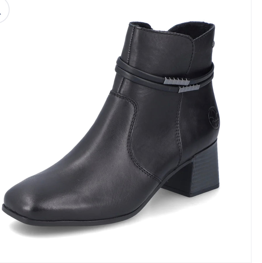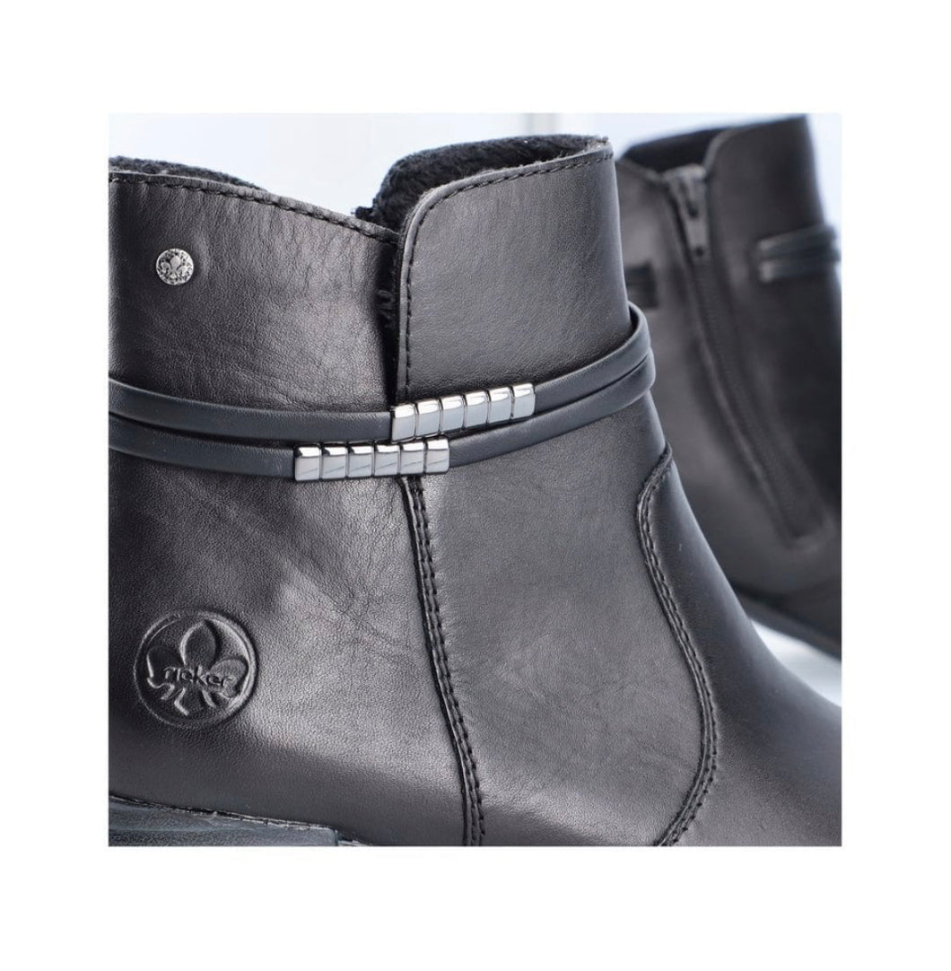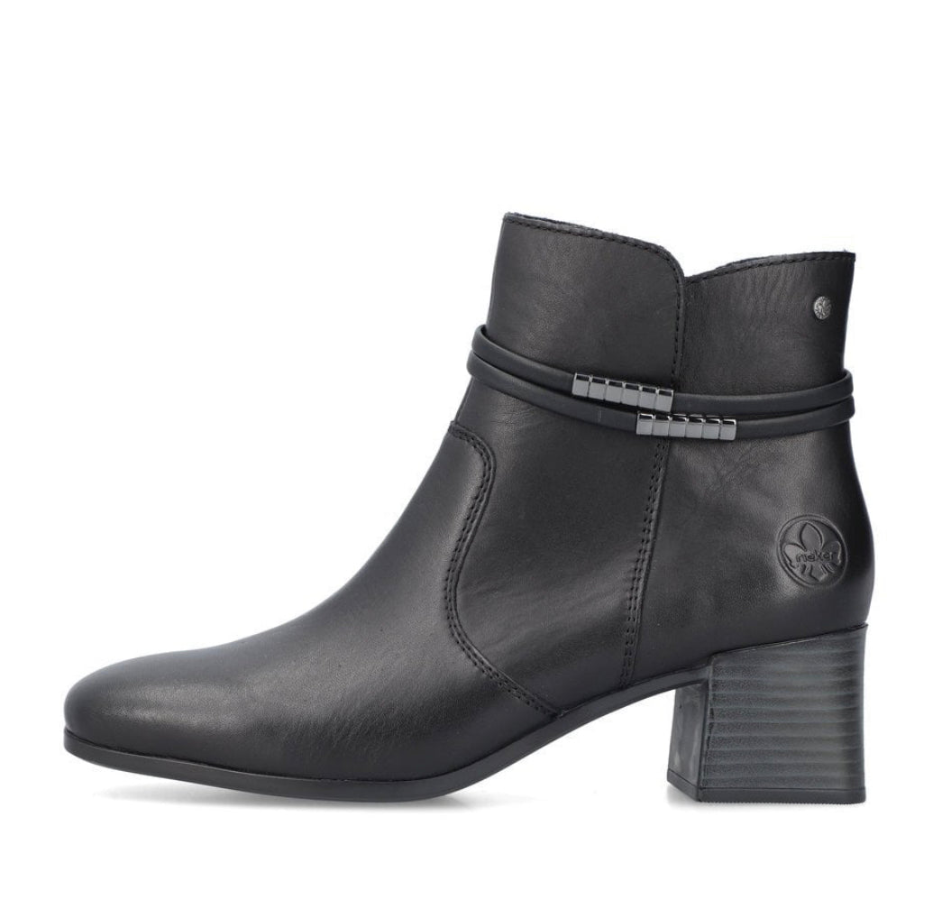 - A stylish block heeled ankle boot from Rieker finished in a classic black leather upper with a metallic charm detail and a warm fleece lining. Featuring a side zip for easy foot entry.