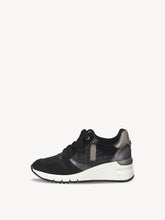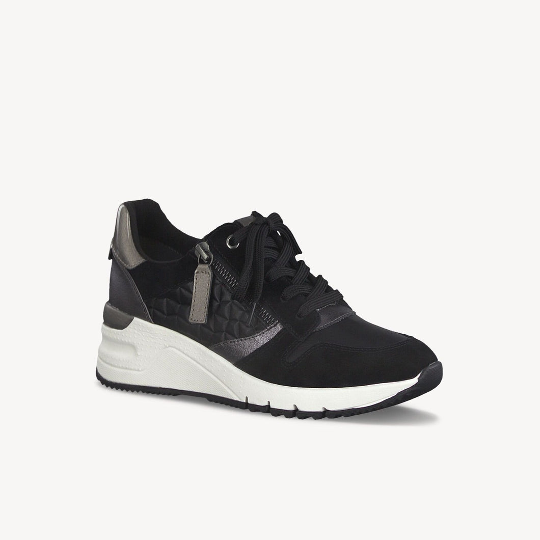 These trainers by Tamaris not only appear chic, the workmanship is also top-class. The easy-care upper is a leather and textile material blend. The heel height is 5,0 cm. Wedged-heeled shoes enable you to enjoy the benefits of high heels, but without tormenting your feet. There`s nothing that can knock you off balance any longer because of the stability and security the continuous heel of these wedges give you while walking.
