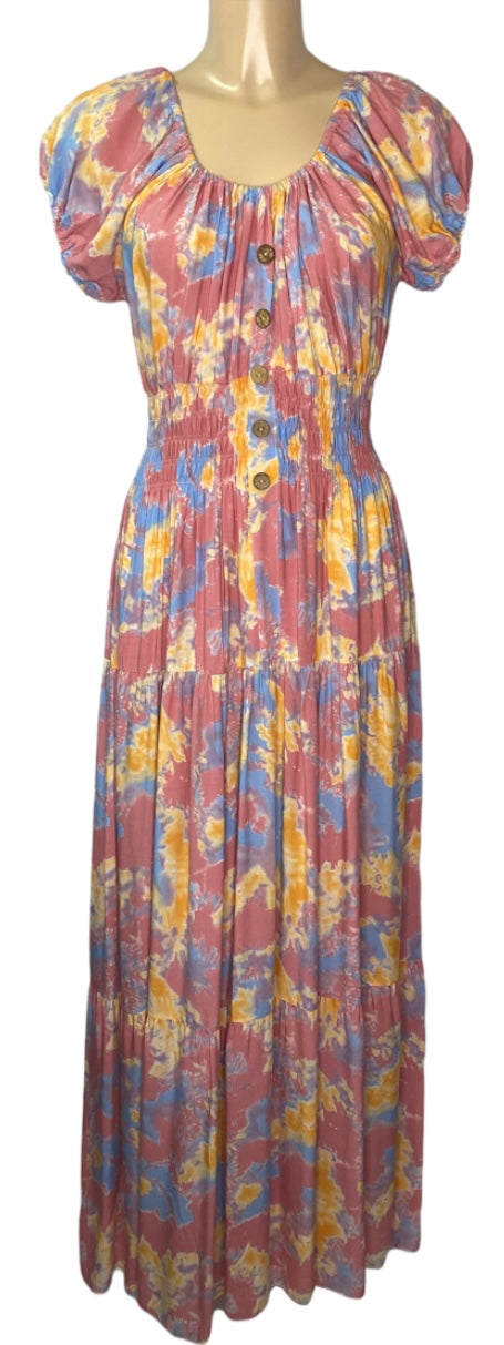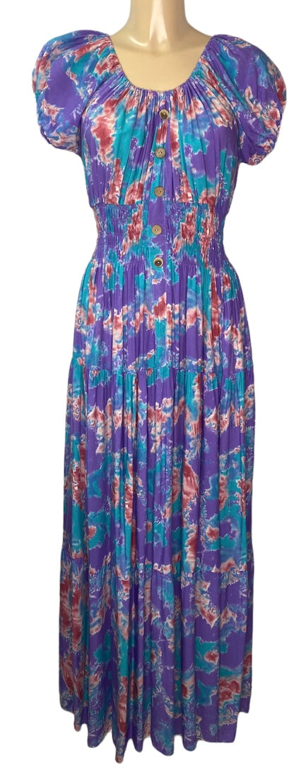 This light weight maxi dress has a flattering tie dye design that can be worn off the shoulder. It is perfect for summery days. It is airy and has a fully elasticated waist. This dress can even be worn with trainers for perfect comfort and stylish look.